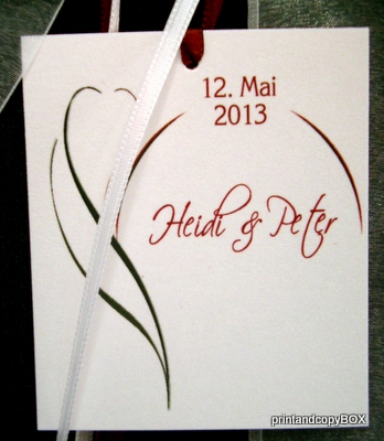An einem Band ist ein Schild mit den Namen des Brautpaares und dem Hochzeitsdatum befestigt.