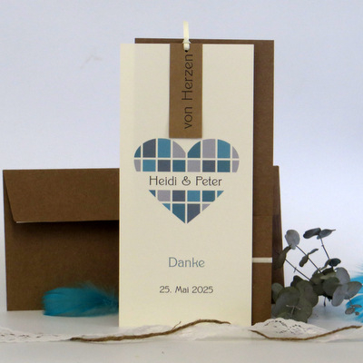 Stilvolle Danksagung aus Kraftkarton mit einer cremefarbenen Karte, die mit tollem Herzmotiv in türkis und dem Text bedruckt ist.