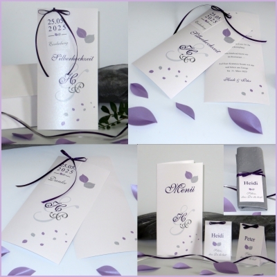 Ausgefallene, mehrlagige Einladung zur Silberhochzeit in lila und grau mit einem tollen Blätterlook.