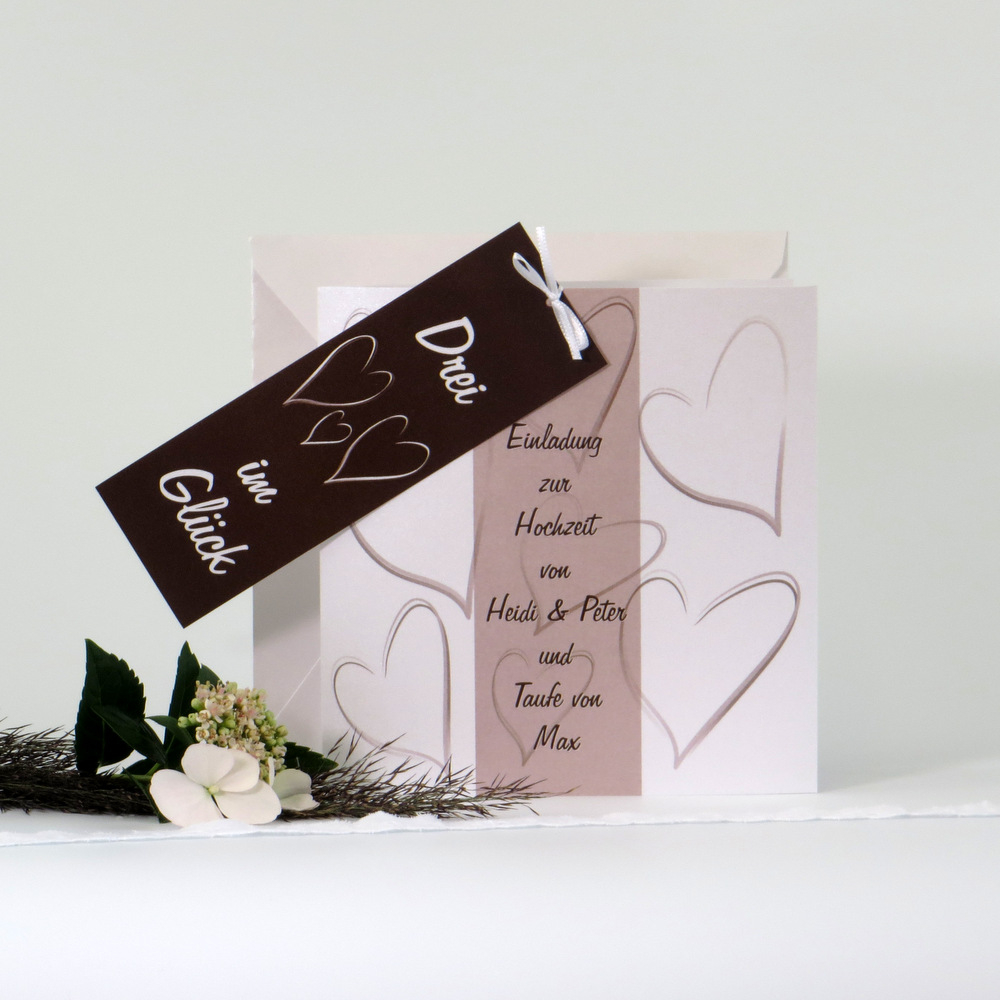 Die Besonderheit dieser Karte ist das angebrachte Schild. Unter diesem ist ein Streifen aufgedruckt. Auf diesem steht Einladung zur Hochzeit von … und Taufe von … Die Karte ist aus weißem Metallickarton gefertigt und hat einen braunen Aufdruck. Die Personalisierung ist im Preis enthalten.