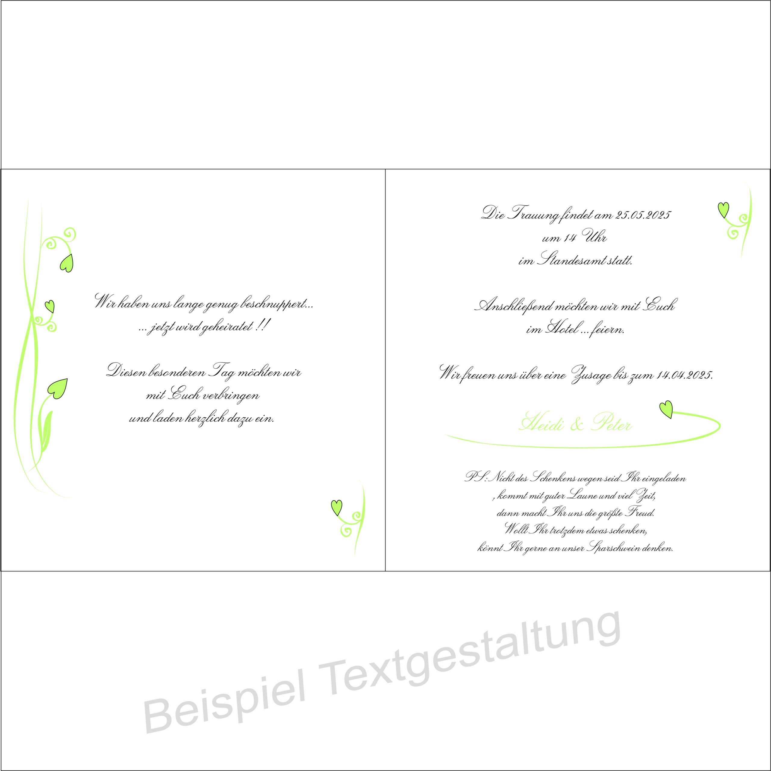 Fröhliche Hochzeitseinladung in frischem grün. Ein bezauberndes Rankenmotiv mit süßen Herzen ergänzt sich perfekt.