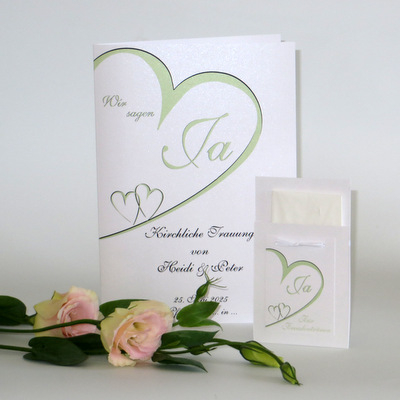 In dezentem lindgrün ist das Herzmotiv bei diesen trendigen Kirchenheften gestaltet. In dem großen Herz steht „Wir sagen Ja“. Zwei kleinere verschlungene Herzen sind in das Herz integriert. Darunter wird noch „Kirchliche Trauung“ mit den Namen des Brautpaares, Hochzeitsdatum und Ort gedruckt.