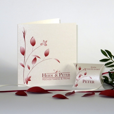 Cremefarbene Hochzeitsmenükarte mit edlen Blättern und Schriften in rot. Sie ist sehr edel und elegant und passt zu einer hochwertigen Hochzeitsdekoration.