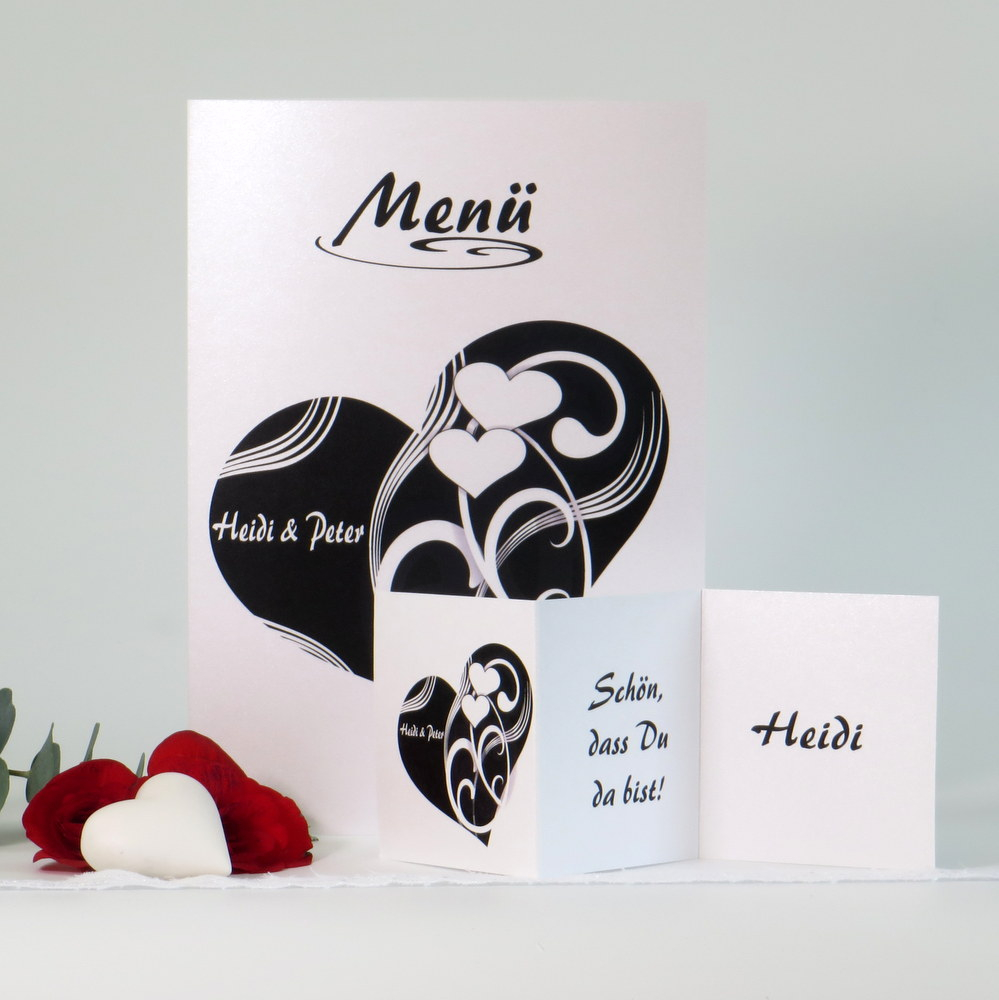 Moderne, personalisierte Menükarte aus weißem Metallickarton mit Aufdruck in schwarz.