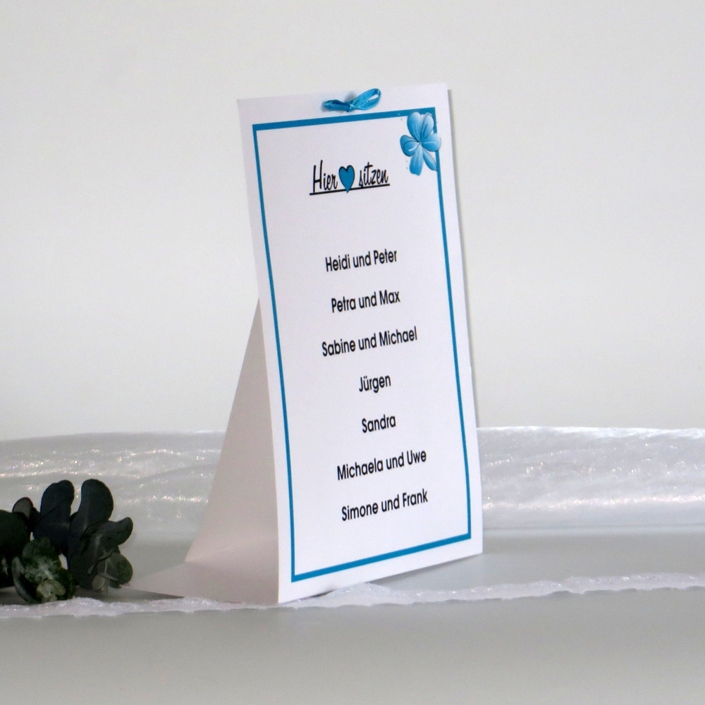 So schön ist eine dekorative und moderne Sitzordnung. Auf die Tischaufsteller aus weißem Glanzkarton mit der Blume in türkis können bis zu 20 Namen aufgedruckt werden. Die Aufsteller liefern wir Ihnen komplett bedruckt und mit der weißen Schleife. Sie können von Ihnen einfach auseinandergeklappt werden.