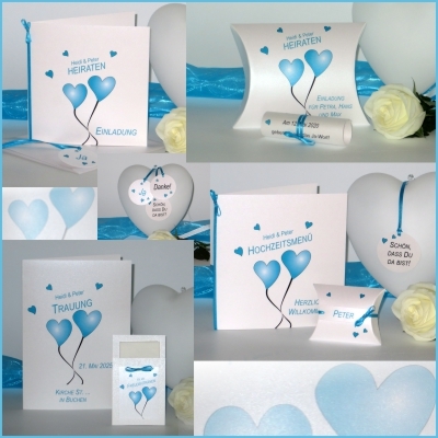 Angesagte Tischkarten mit dem Namen des Gastes und dem süßen Design aus Herzballons in türkis. Sie sind zudem noch raffiniert als Aufsteller gefertigt, in den Sie Hochzeitsmandeln oder ein kleines Gastgeschenk legen können. An den Aufstellern ist eine kleine Schleife befestigt. Sie komplettiert den trendigen Look.
