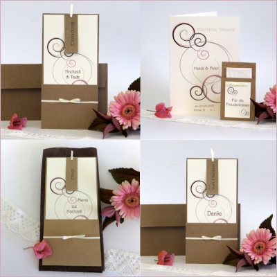 Traufeinladung mit erstklassigem Kringelmotiv in rosa und braun sowie charmantem Kraftkarton für den rustikalen Touch.